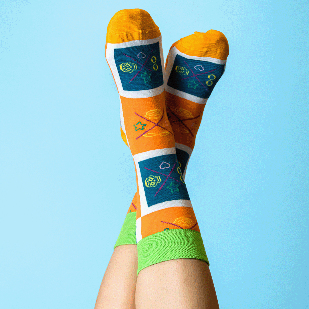 Orangeblaue bunte Socken mit klaren Linien und aussagekräftige Symbolen.